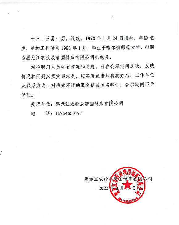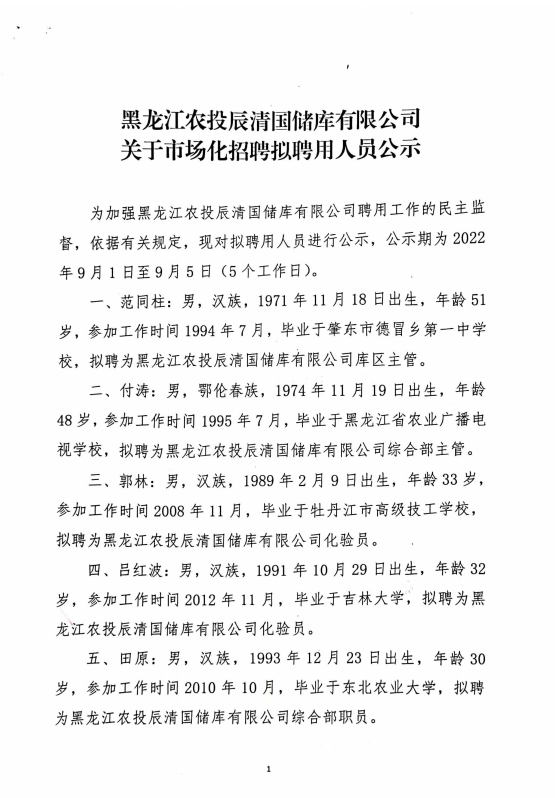 黑龍江農(nóng)投辰清國(guó)儲(chǔ)庫(kù)有限公司關(guān)于市場(chǎng)化招聘擬聘用人員公示