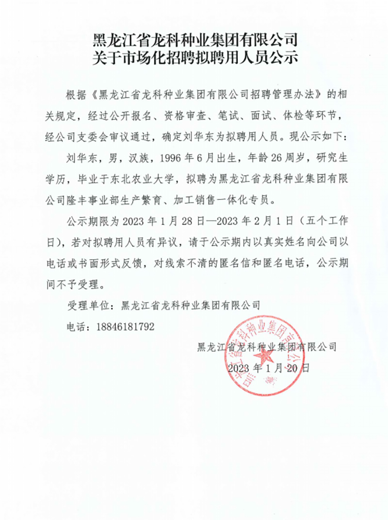 黑龍江省龍科種業(yè)集團(tuán)有限公司關(guān)于市場(chǎng)化招聘擬聘用人員公示
