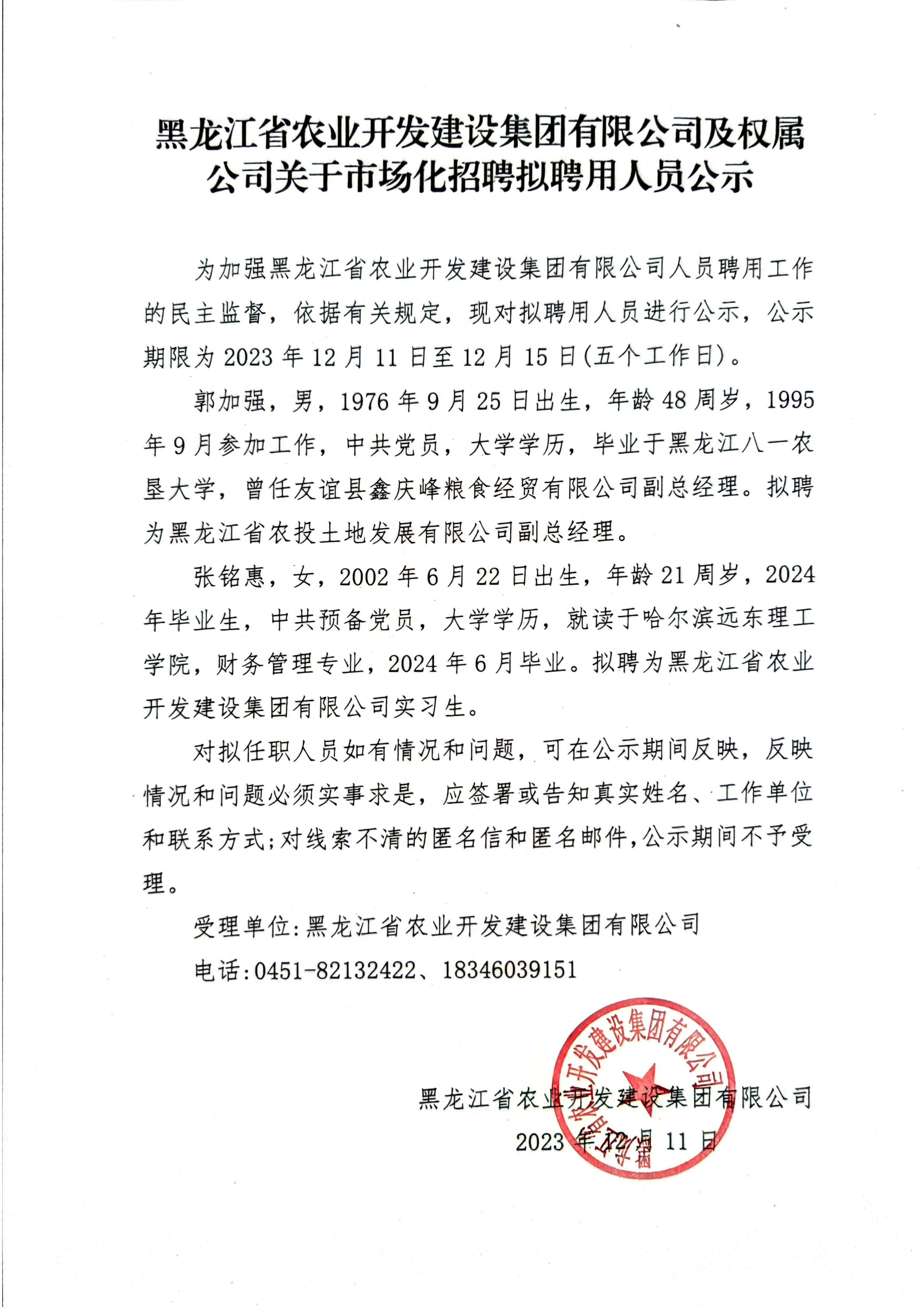 黑龍江省農(nóng)業(yè)開發(fā)建設(shè)集團(tuán)有限公司及權(quán)屬公司關(guān)于市場化招聘擬聘用人員公示