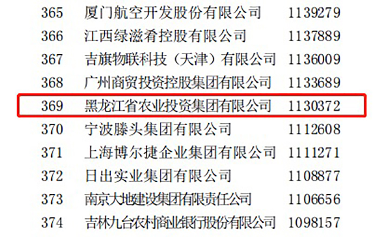 2021年9月25日,“2021中國500強企業(yè)高峰論壇”在長春舉行,中國企業(yè)聯(lián)合會、中國企業(yè)家協(xié)會在會上發(fā)布了中國服務業(yè)企業(yè)500強名單,黑龍江省農(nóng)業(yè)投資集團有限公司以2020年營業(yè)收入113.03億元的業(yè)績位列2021中國服務企業(yè)第369位。