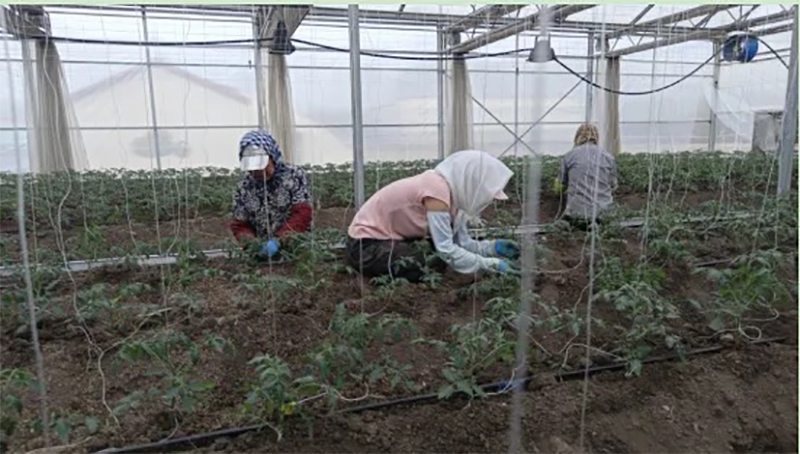 綏化加工廠陽光溫室工人為柿子秧打岔