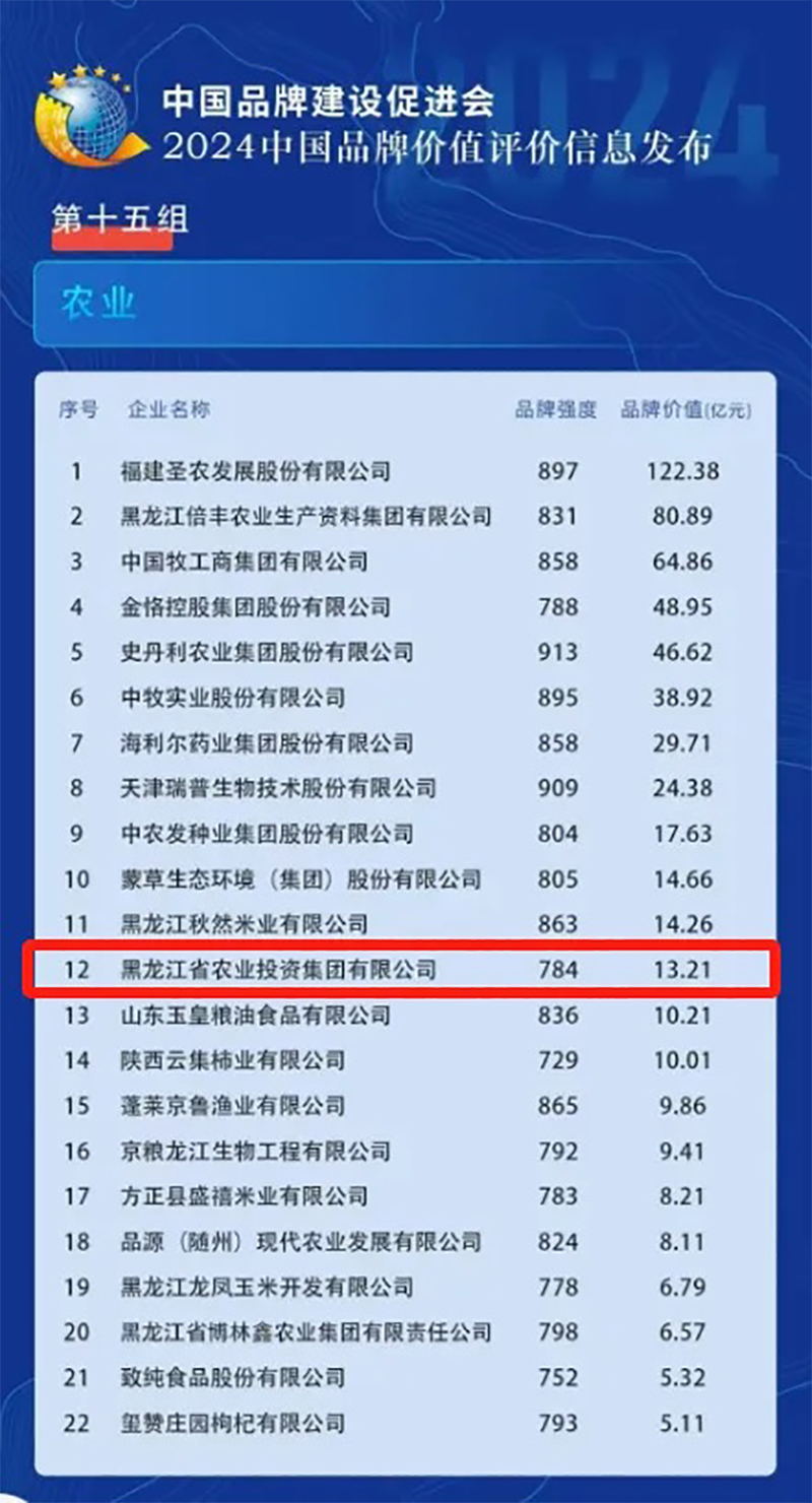 5月11日,新華社、中國品牌建設(shè)促進會、中國資產(chǎn)評估協(xié)會等單位在浙江德清聯(lián)合發(fā)布“2024中國品牌價值評價信息”。黑龍江省農(nóng)業(yè)投資集團有限公司上榜第十五組農(nóng)業(yè)第12位。
