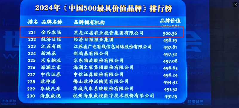 6月19日,由世界品牌實(shí)驗(yàn)室(World Brand Lab)主辦的2024年(第二十一屆)“世界品牌大會(huì)”暨2024年《中國(guó)500最具價(jià)值品牌》發(fā)布會(huì)在北京舉行。會(huì)上,發(fā)布了2024年《中國(guó)500最具價(jià)值品牌》分析報(bào)告。黑龍江省農(nóng)業(yè)投資集團(tuán)有限公司(以下簡(jiǎn)稱“農(nóng)投集團(tuán)”)所屬農(nóng)投食品集團(tuán)“金谷農(nóng)場(chǎng)”品牌以500.36億元品牌價(jià)值榮登中國(guó)500最具價(jià)值品牌排行榜第221位。農(nóng)投集團(tuán)黨委書(shū)記、董事長(zhǎng)常玉春代表農(nóng)投集團(tuán)領(lǐng)取獎(jiǎng)杯和獎(jiǎng)牌。