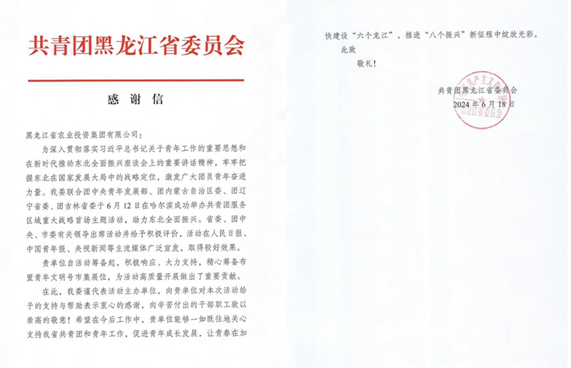 近日,共青團(tuán)中央“青春為中國(guó)式現(xiàn)代化挺膺擔(dān)當(dāng)”——共青團(tuán)助力服務(wù)新時(shí)代東北全面振興青春建功主題活動(dòng)在哈爾濱舉辦。農(nóng)投集團(tuán)團(tuán)委收到來(lái)自共青團(tuán)黑龍江省委員會(huì)的感謝信,感謝農(nóng)投集團(tuán)的大力支持和付出,并在活動(dòng)中展現(xiàn)了農(nóng)投集團(tuán)青年風(fēng)采。農(nóng)投青年用青春的方式表達(dá)“身在最北方、心向黨中央”的志向,釋放“青年+東北”的組合效能,展現(xiàn)青春為新時(shí)代東北全面振興挺膺擔(dān)當(dāng)?shù)男判臎Q心和火熱實(shí)踐。
