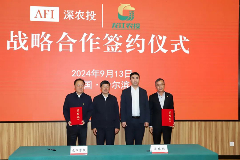 9月13日,黑龍江省農(nóng)業(yè)投資集團(tuán)有限公司(以下簡稱龍江農(nóng)投)與深圳農(nóng)業(yè)與食品投資控股集團(tuán)有限公司(以下簡稱深農(nóng)投)在深圳(哈爾濱)產(chǎn)業(yè)園舉行戰(zhàn)略合作簽約儀式。深圳市政府黨組成員、副市長代金濤,黑龍江省國資委黨委委員、副主任張玉福出席活動,深農(nóng)投黨委書記、董事長黃偉,龍江農(nóng)投黨委書記、董事長常玉春分別代表各自企業(yè)簽約。