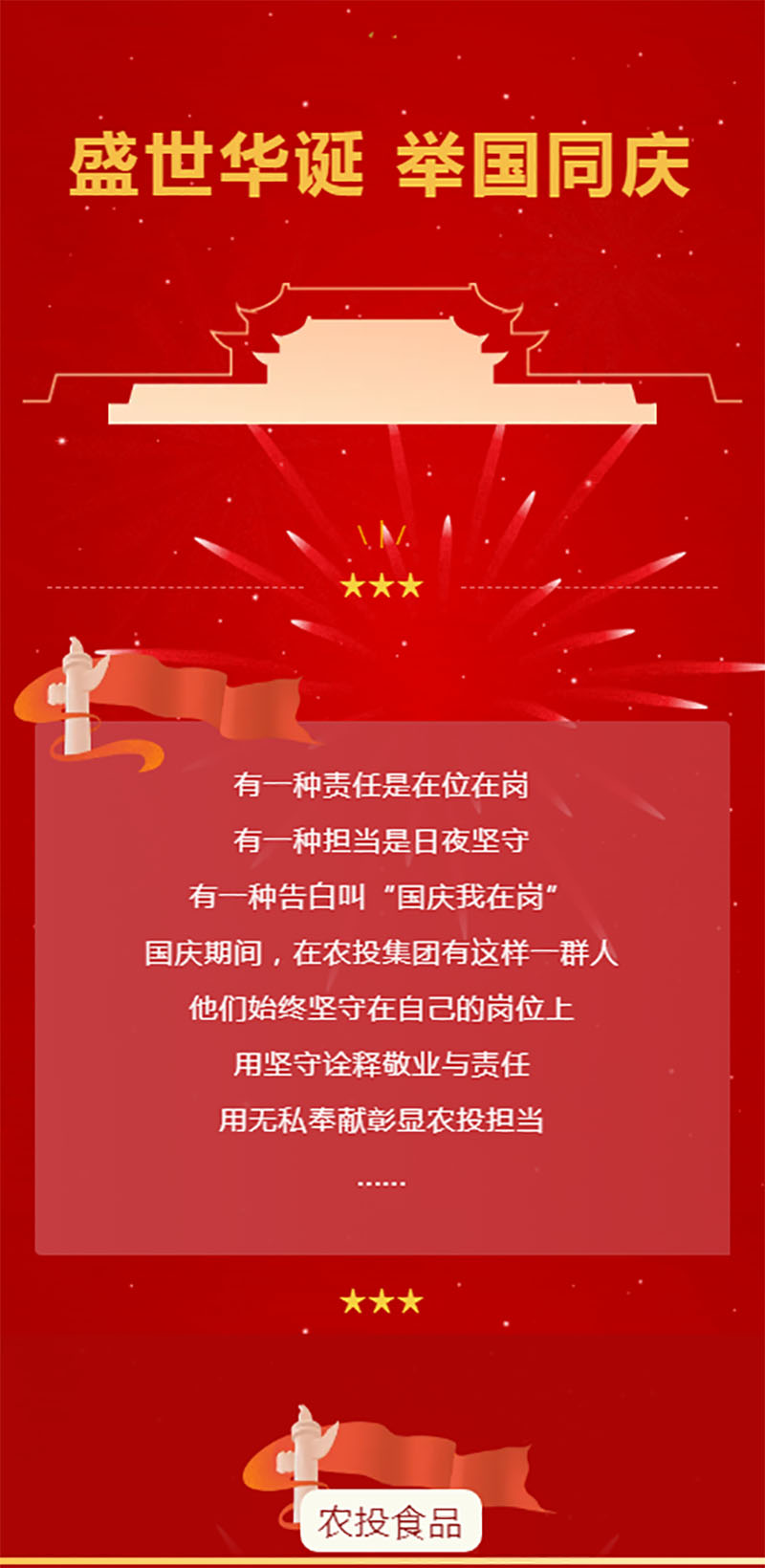 國慶期間,黑龍江省農(nóng)投食品集團有限公司廣大干部員工爭分奪秒,奮戰(zhàn)在生產(chǎn)經(jīng)營一線,從辦公區(qū)到生產(chǎn)車間,處處洋溢著祥和有序的工作氛圍,他們在平凡崗位上默默耕耘,在各個角落里發(fā)光發(fā)熱,用實際行動詮釋著“節(jié)日我在崗,工作不松勁”的奉獻精神,用始終如一的堅守,詮釋國資國企擔當,用拼搏奮斗的身姿,書寫公司發(fā)展精彩答卷。