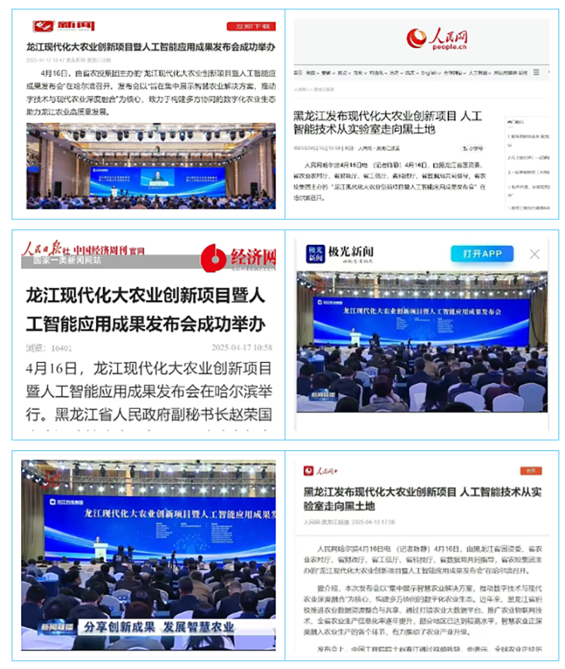 4月16日,由省農(nóng)投集團(tuán)主辦的龍江現(xiàn)代化大農(nóng)業(yè)創(chuàng)新項目暨人工智能應(yīng)用成果發(fā)布會在哈爾濱召開。本次大會受到人民日報社《中國經(jīng)濟(jì)周刊》、黑龍江日報、黑龍江省廣播電視臺《新聞聯(lián)播》、人民網(wǎng)、新華網(wǎng)、中國日報網(wǎng)、新浪財經(jīng)、龍頭新聞、極光新聞、東北網(wǎng)等媒體的關(guān)注,并紛紛轉(zhuǎn)載報道。