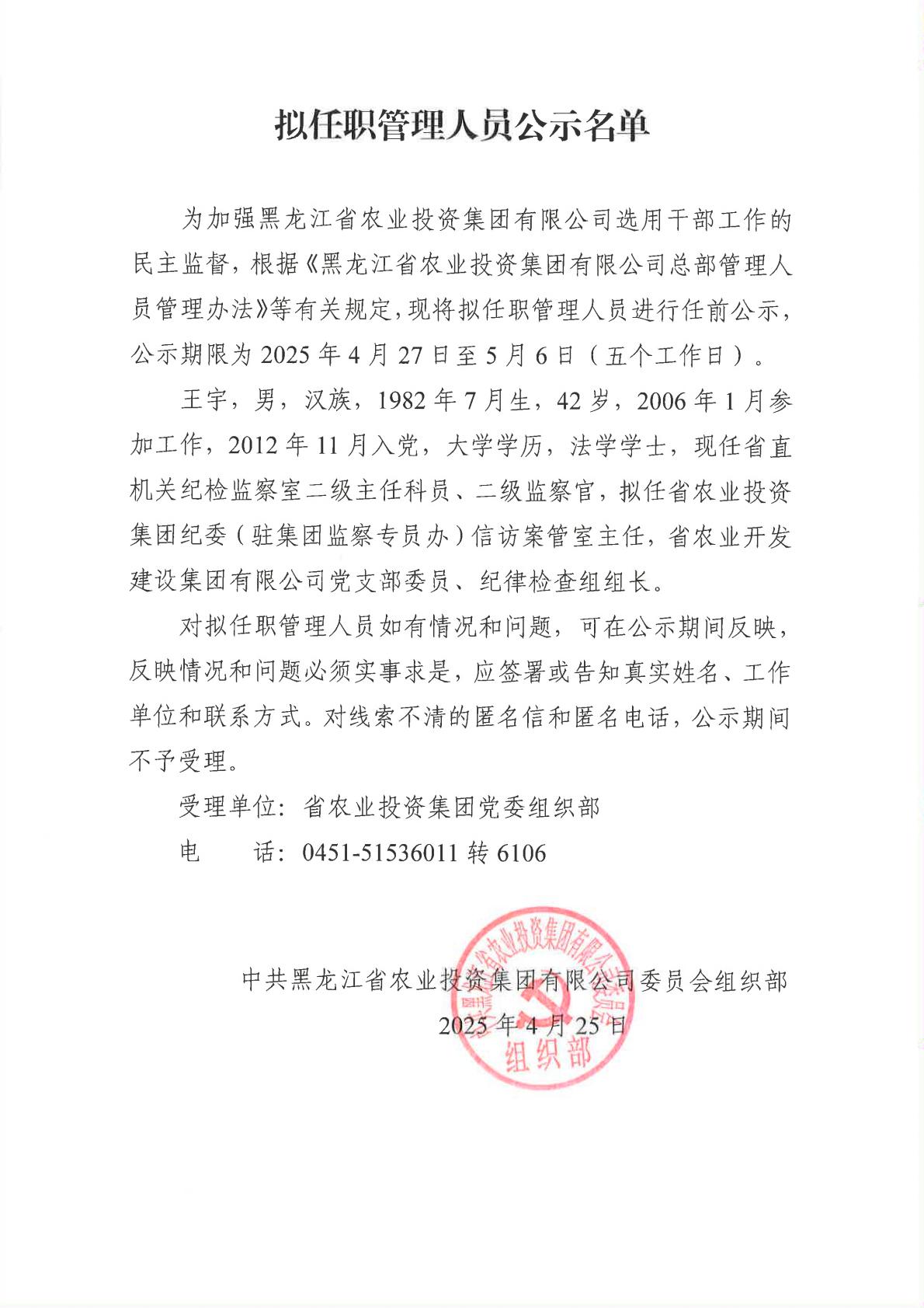 黑龍江省農(nóng)業(yè)投資集團(tuán)有限公司關(guān)于市場化選聘擬聘用人員公示