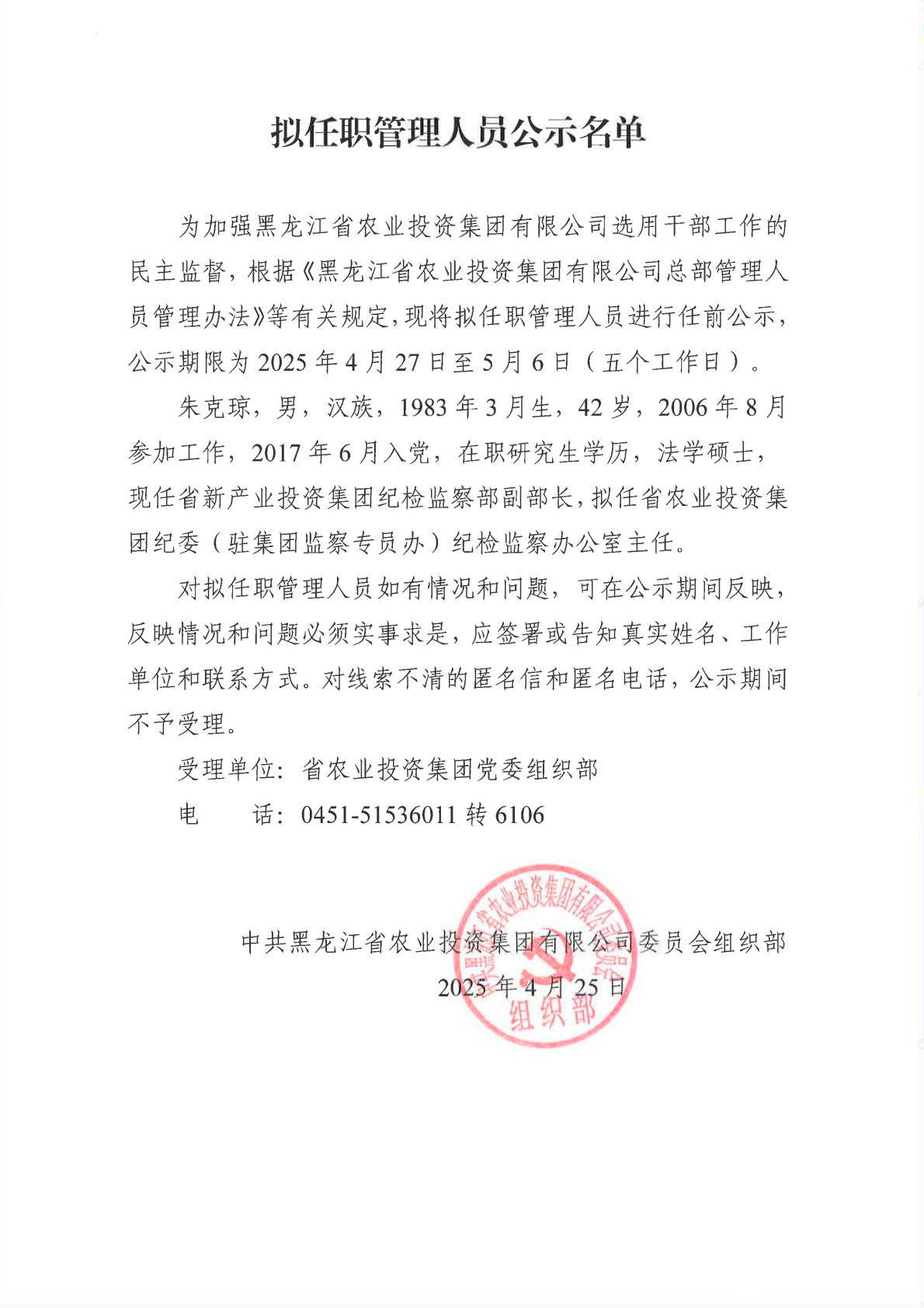 黑龍江省農(nóng)業(yè)投資集團(tuán)有限公司關(guān)于市場化選聘擬聘用人員公示