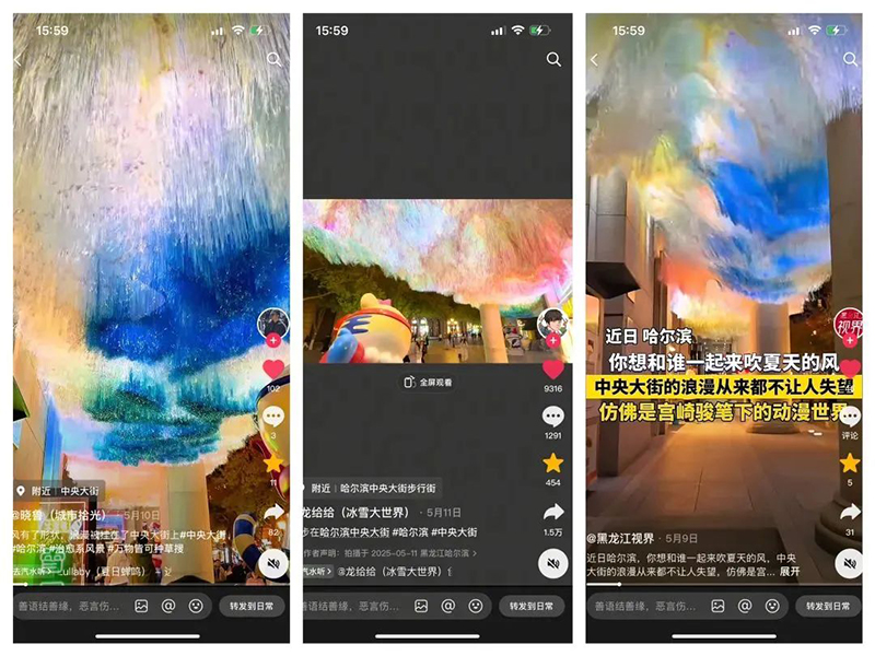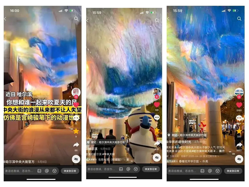 立足“酒店即目的地”的發(fā)展定位,金谷大廈借鑒西安、廈門等城市網(wǎng)紅地標(biāo)運營經(jīng)驗,于避暑旅游旺季來臨前完成“天空之境”主題美陳場景建設(shè)。該場景占地約66平方米,以動態(tài)藝術(shù)裝置重構(gòu)空間美學(xué)——采用特種細(xì)絲面料打造由北向南延展的“爾濱浪花”矩陣,通過微風(fēng)動力學(xué)裝置模擬江海與天穹的光影交織,構(gòu)建虛實交融的沉浸式視覺空間。自落成以來,該場景日均吸引游客及攝影創(chuàng)作者超2000人次,在抖音、小紅書等平臺形成“#爾濱天空之境”話題矩陣,相關(guān)短視頻播放量突破1200萬次,成功躋身哈爾濱城市地標(biāo)打卡熱榜TOP10。